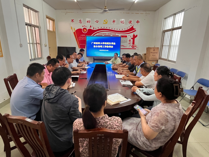 为进一步推进校园及周边环境综合治理工作,9月16日上午,保卫处组织召开校园及周边综合治理工作协调会,会议由保卫处处长蒋建国主持,校保卫处、校办产业管理中心、附属小学,南宁市青秀区中山街道办、津头社区、交警七大队、综合行政执法队中山大队等9家单位的负责人参会。